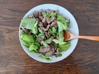 Das Geschnetzelte mit dem Rest vermischen, schön anrichten, Servieren